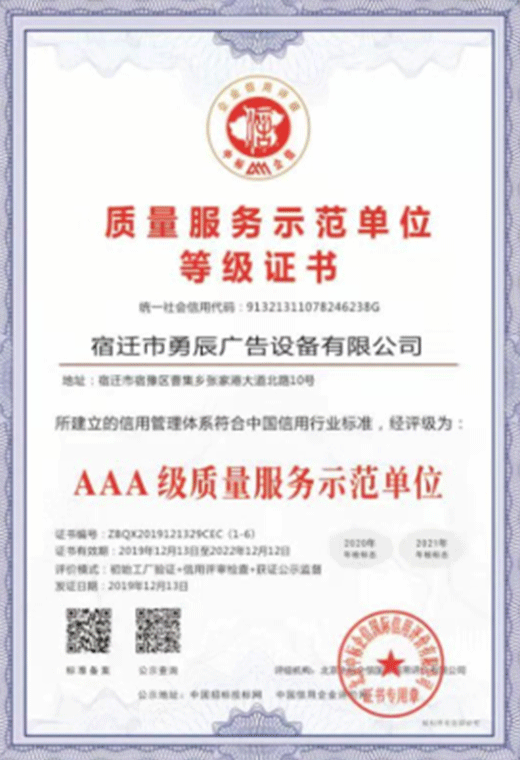 質(zhì)量服務示范單位等級證書