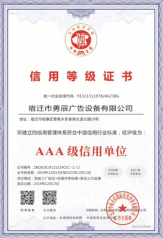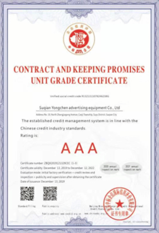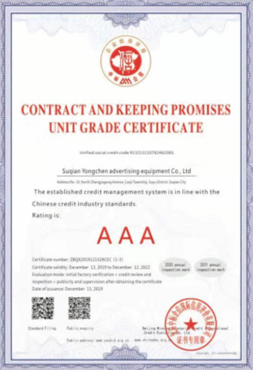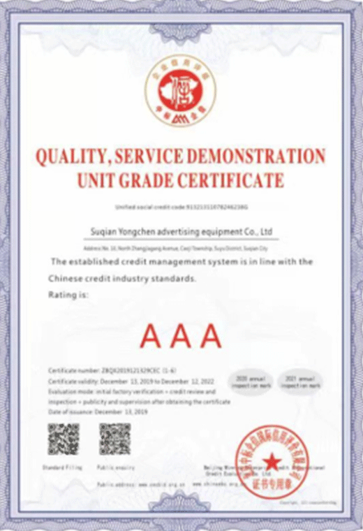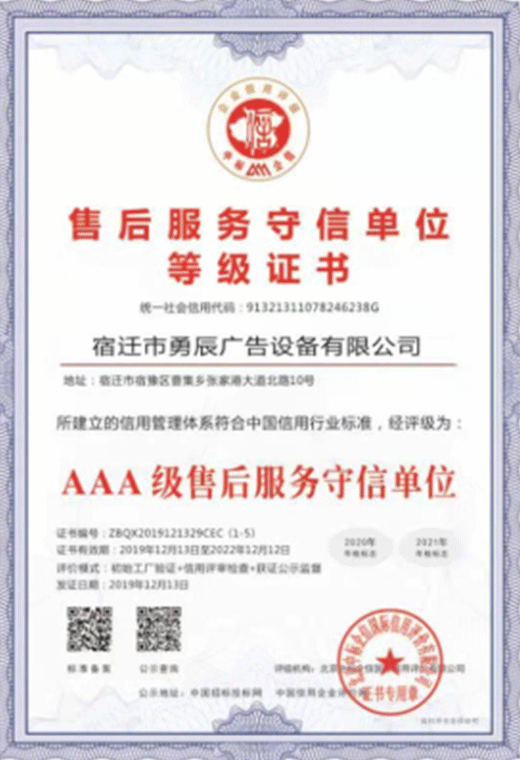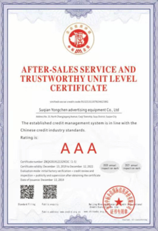 售后服務守信單位等級證書