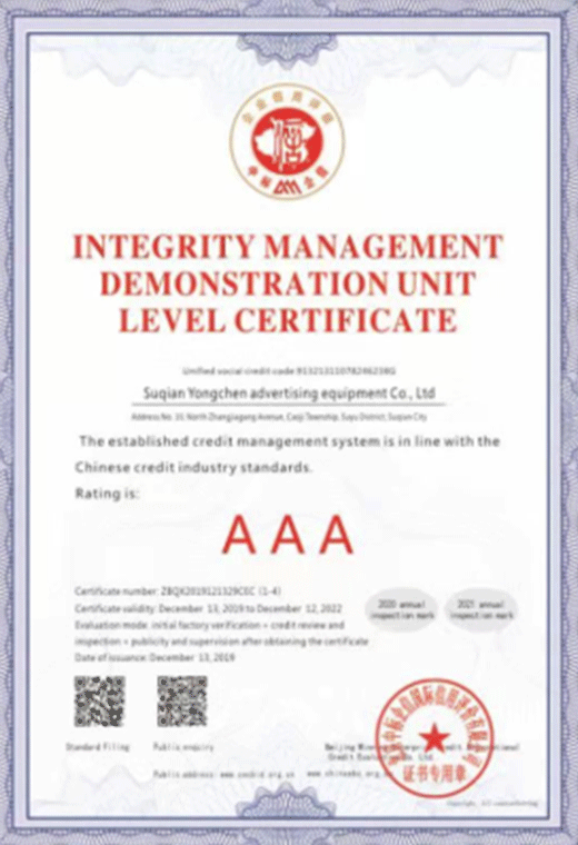 誠信經(jīng)營示范單位等級證書